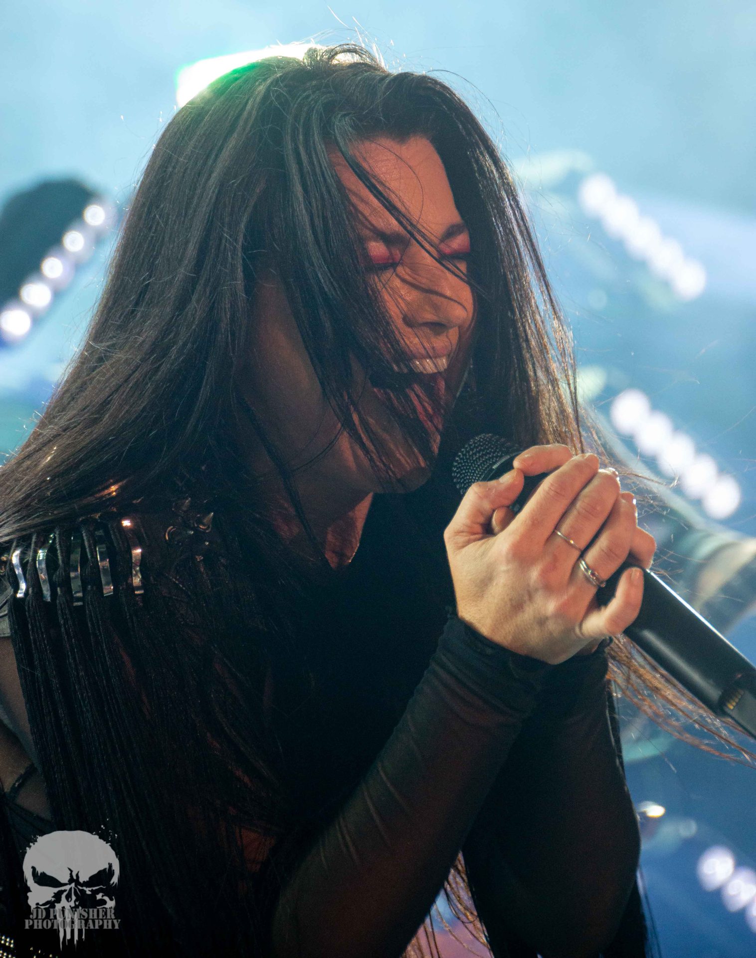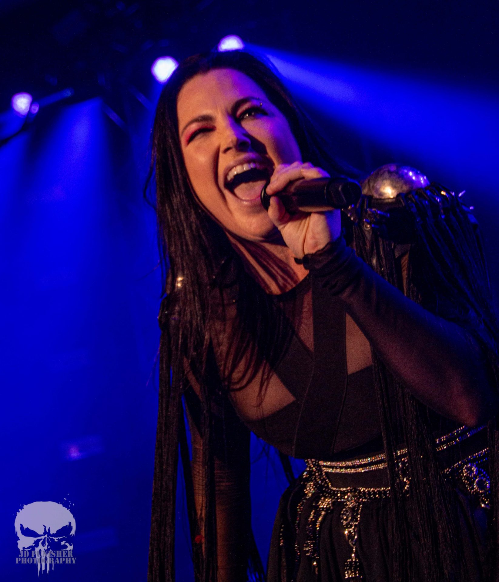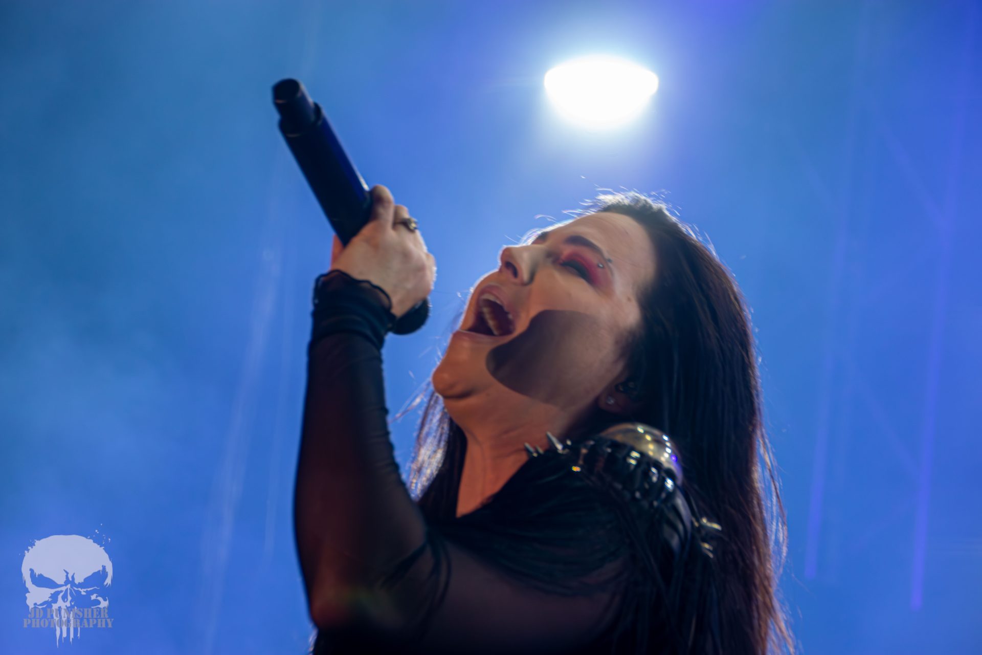 As the Evanescence logo began to glow, backlit by an impressive light show of lasers and strobe lights, a techno based intro emitted from the PA system, echoed back by a cheer and roar of voices from the adoring fans while the band members took to the stage. Finally, the voice of the gothmother herself, Amy Lee, took to the stage, warbling etherically as the crowd became entranced in her presence. Opening with Broken Pieces Shine, the crowd found their voice and regained the ability to move again, headbanging and dancing to the song.