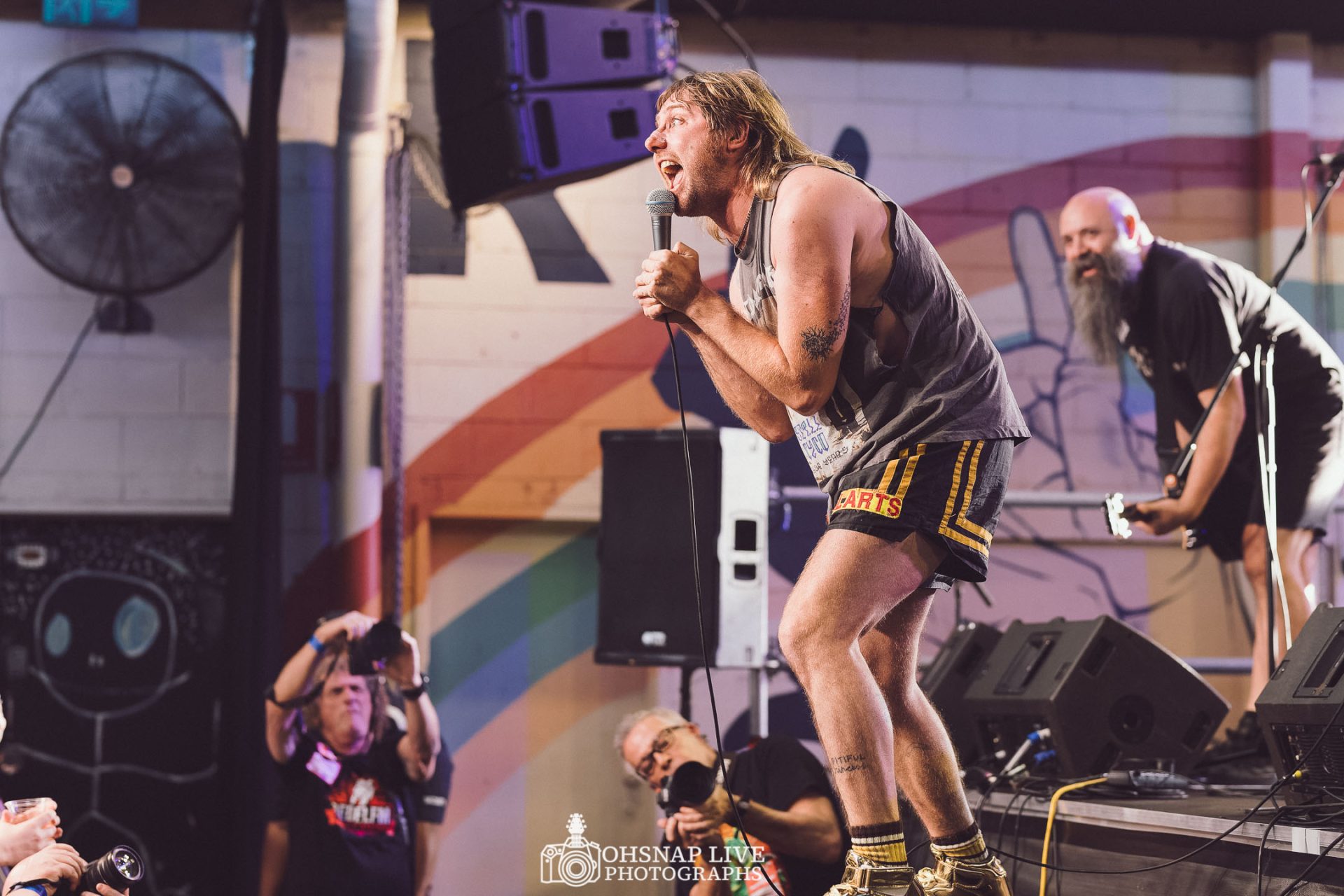 Bassist Milla throws her guitar at Chris as the two swap places for an aggressive three minutes of loudness with Milla swinging her chain belt into drums, cymbals and threatening the overhead lights. At this point its pure chaos on stage the likes of which Australian crowds rarely see. Love song “Grabbing My Butt” sees Milla joining the front row for a round of drinks before another off-kilter but fast-paced song “I Wish Australia Had Its Guns Again.” A cover of ABBA’s “S.O.S.” later and this absolute performance from professional mad people is over. What a spectacle.