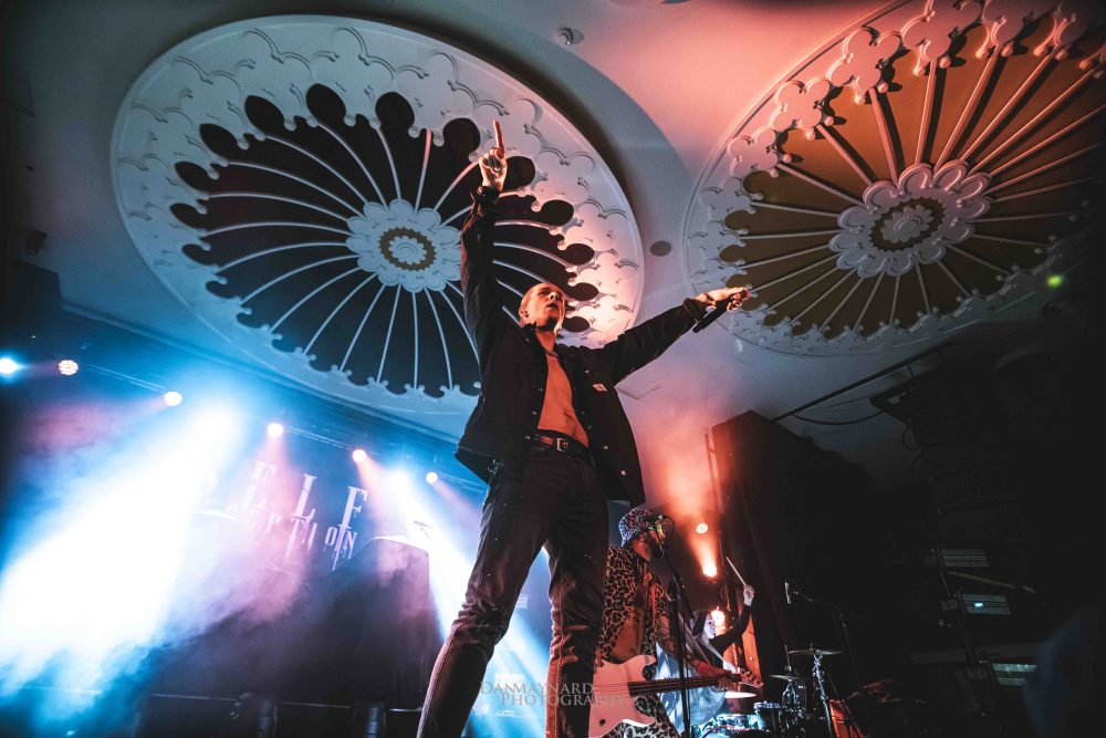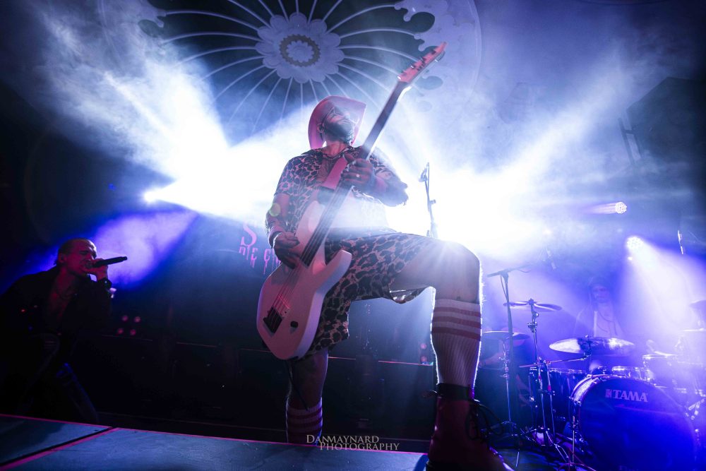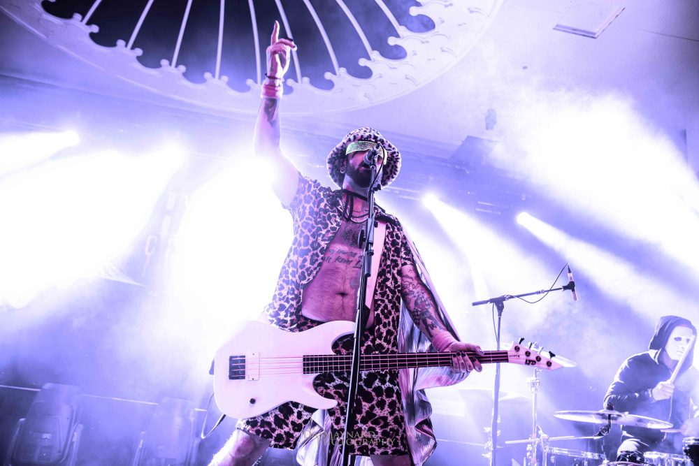 With a rumbling tremor of bass, Self Deception prepare to take the stage as the crowd bounces to their techno intro. Drummer Erik Eklund emerged garbed in a white mask, while bassist Patrik Hallgren opts for a more flamboyant leopard print shirt, shorts and bucket hat ensemble. Front man Andreas Clark rocks a chains and double denim number with a bare torso beneath his overcoat because of course, and guitarist Erik Eklund is the epitome of rock and roll, battle jacket ready to go to war. The Swedish rockers open with Smoke You Out, prepping the crowd to get noisy.