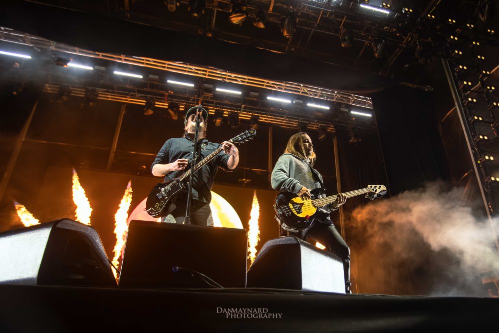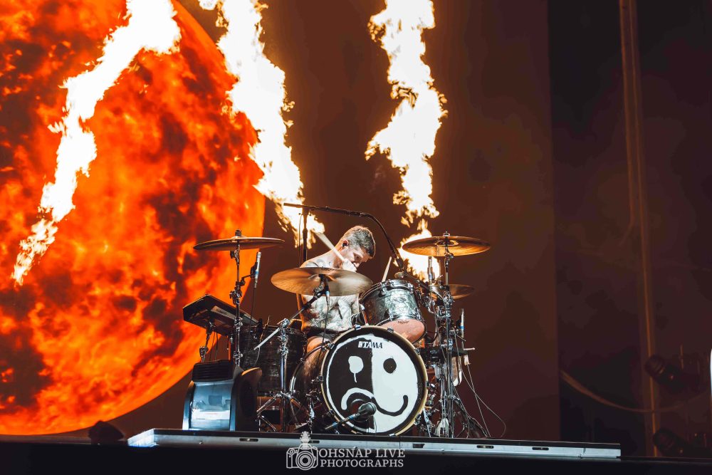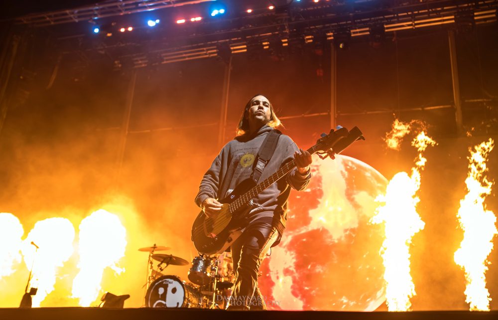 But now it’s time for the main event, the piece de resistance, the one, the only, Fall Out Boy! Moseying on stage like they own the joint, the four piece are in fine form cracking out the opening song Love From The Other Side off their latest album So Much (For) Stardust. The crowd bounces and sways to the electric energy coming off the stage feeding the literal flames that burst from not only behind the drum riser, but also Pete Wentz’s bass guitar during a fiery (pun intended) rendition of The Phoenix. Break out hit, Sugar, We’re Goin’ Down follows much to the crowd’s delight before the curtains open to an epic stage design and the band belts out hit after hit to the adoring crowd.