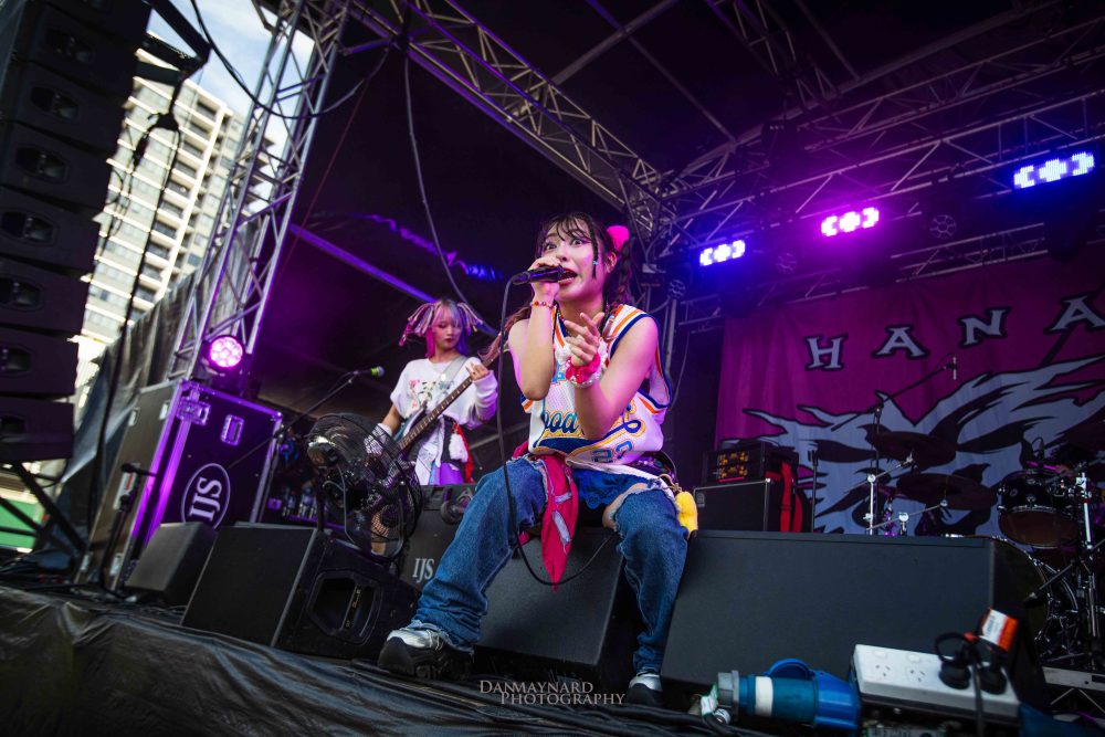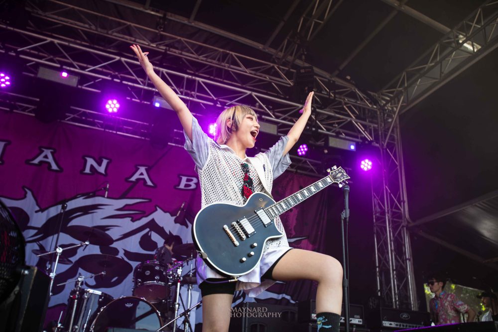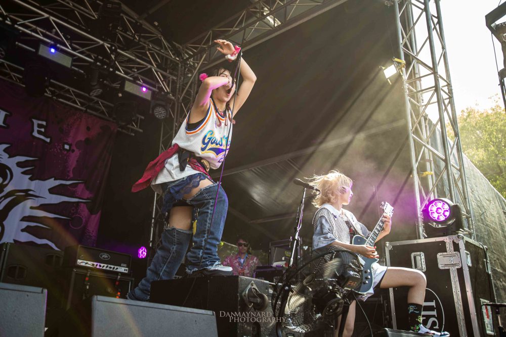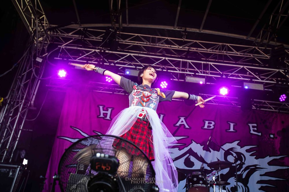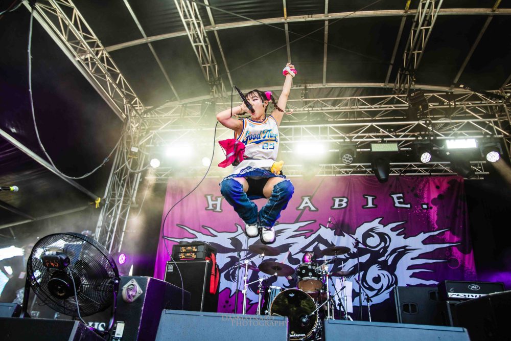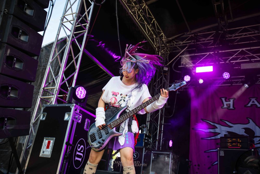 The all-female Japanese metalcore crew of HANABIE. are pulling the biggest crowd on stage 5 of the day so far and fans and curious onlookers alike are enthralled at what’s unfolding on the stage. Co-vocalists Yukina and Matsuri (who doubles on guitar duties as well) are having the time of their life despite the sun shining directly into the stage. Borrowing heavily from their latest album Reborn Superstar! the band bend genres amongst the best of them and are just a hell of a lot of fun to watch!