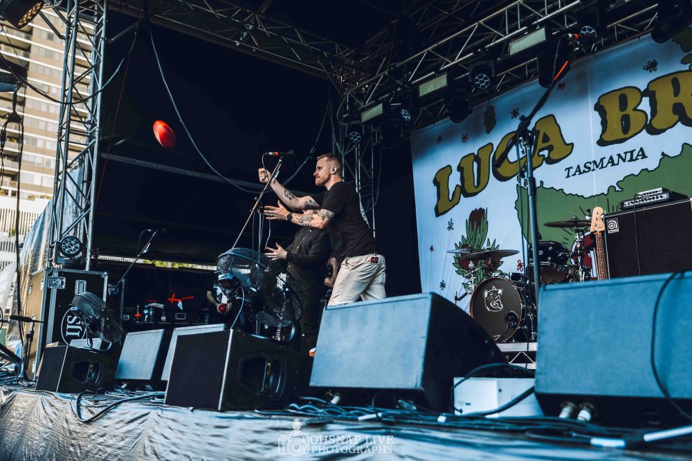 As the day progresses so too does the temperature soar nesting somewhere in the mid-to-late 30’s in terms of degrees but the feel temperature on the ground is surely higher. This is definitely the case inside the tent that houses Stages 3 & 4 but as Sydney-siders Stand Atlantic smash out hit after hit of their brand of electro-tinged rock the crowd seems unfazed by the increasing heat and they 100% match the energy that pours off the stage turning the side stages into a swirling, sweaty mess while the band closes out their set in a flurry of strobes and smoke pillars backed by Molotov [OK] off last years f.e.a.r album.