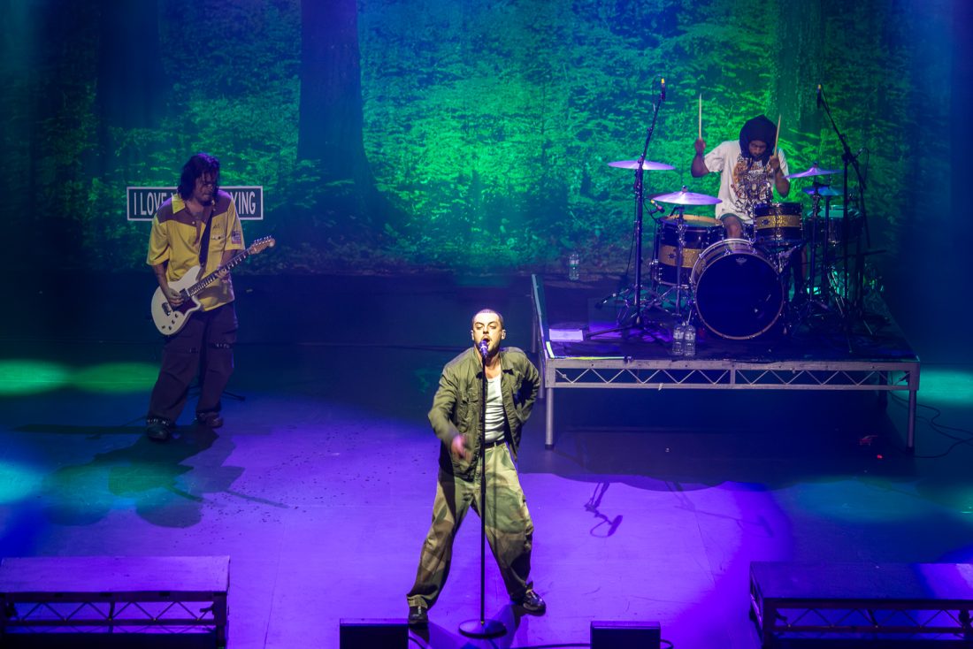 A single spotlight illuminated the stage as grandson finally took to the stage, sunglasses on and freshly buzzed hair, shouting “Brisbane how the fuck are you feeling?” He and his bandmates, Leo Varella on guitar and Tobias Kelly on drums, kicked off the set with Two Along Their Way, with so much energy and charisma, the crowd burst to life. The stage presence of grandson himself with his gesturing of lyrics and encouragement of the crowd to jump and sing along was electric