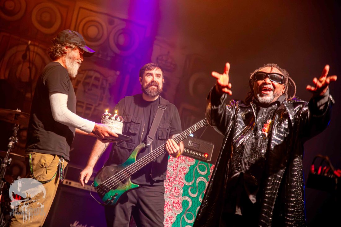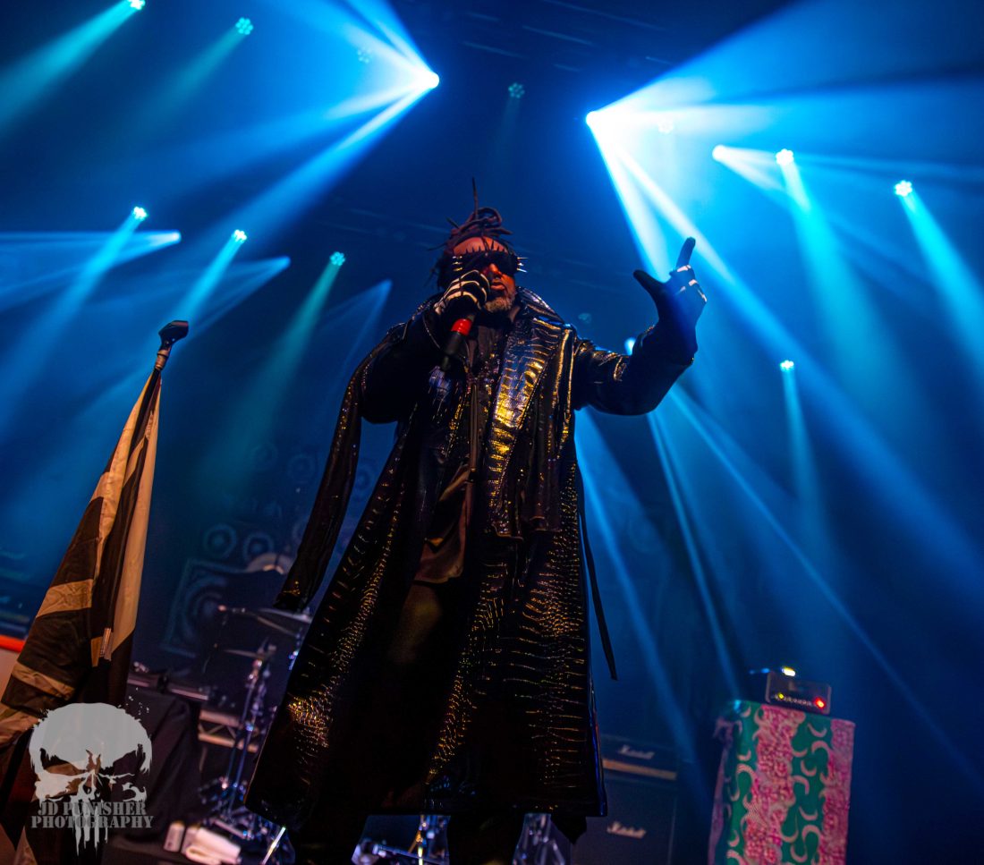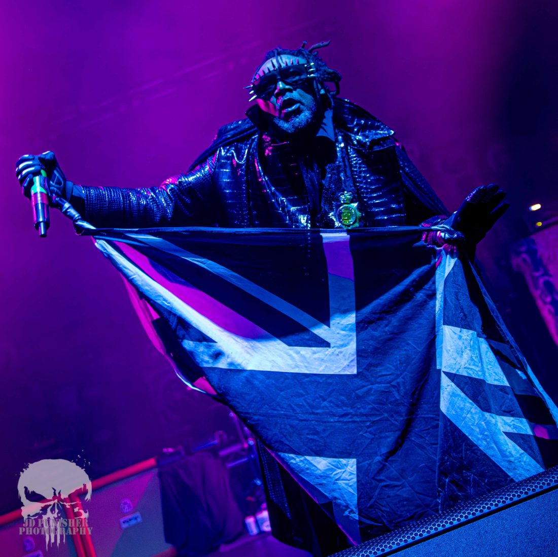 A remix of the Imperial March took over the unsuspecting crowd and Skindred began to take to the stage, welcomed by cries and cheering from the crowd. And as the always dressed to impress, ultra charismatic frontman, Benji Webbe, took his place center stage (of course) behind a mic stand draped in a greyscale union jack flag, they opened with Set Fazer’s from their most recent album, Smile. And smile we did!