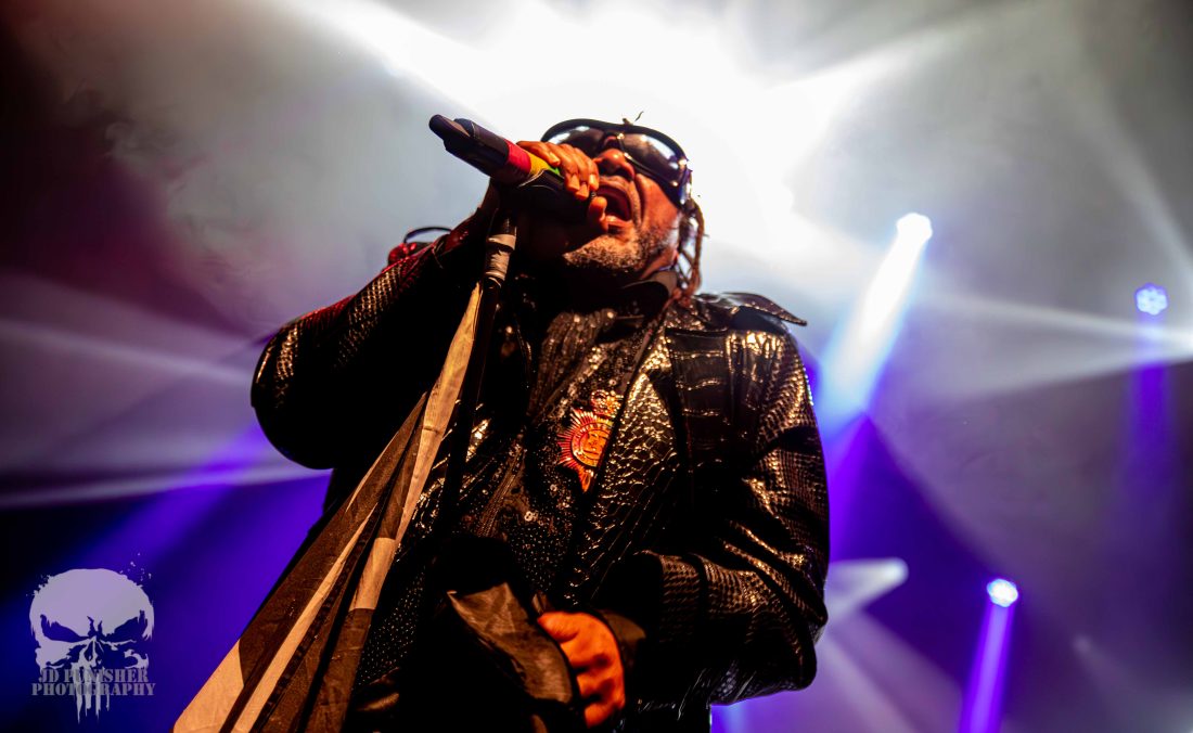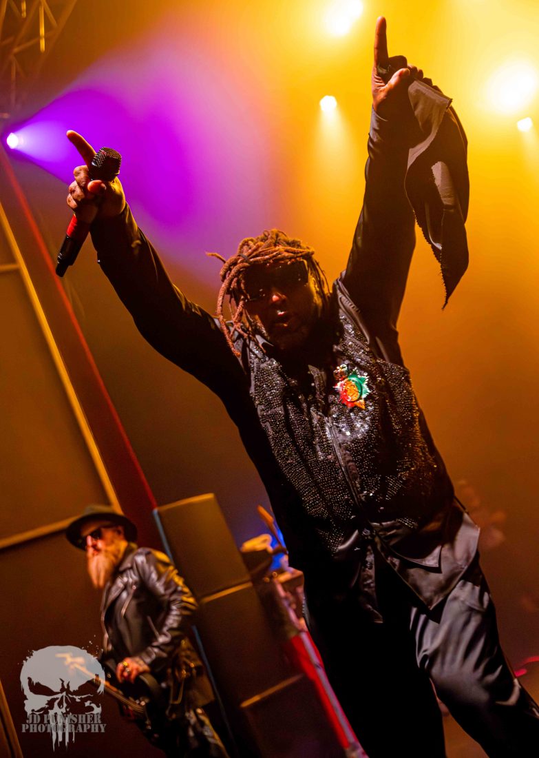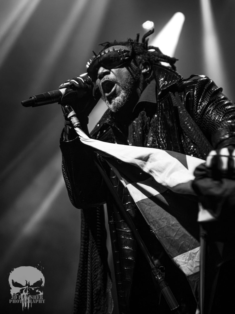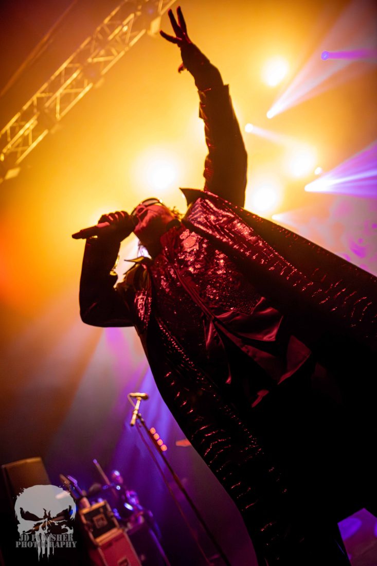 Webbe, garbed in a shiny black scaled overcoat, glittery black waistcoat and scarf, black slacks and shirt, grooved and danced his way around the stage, demanding the crowds undivided attention, which they blissfully provided. The frontman challenged the crowd with a series of vocal calls, calling them out if they didn’t meet his impeccably high standards. It’s easy to be the best when there’s no one like you, and no one is like Benji Webbe.
