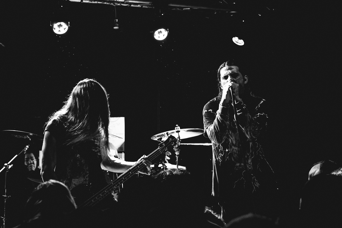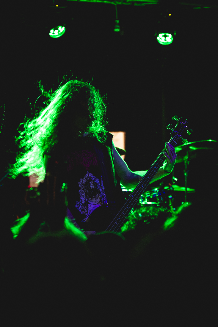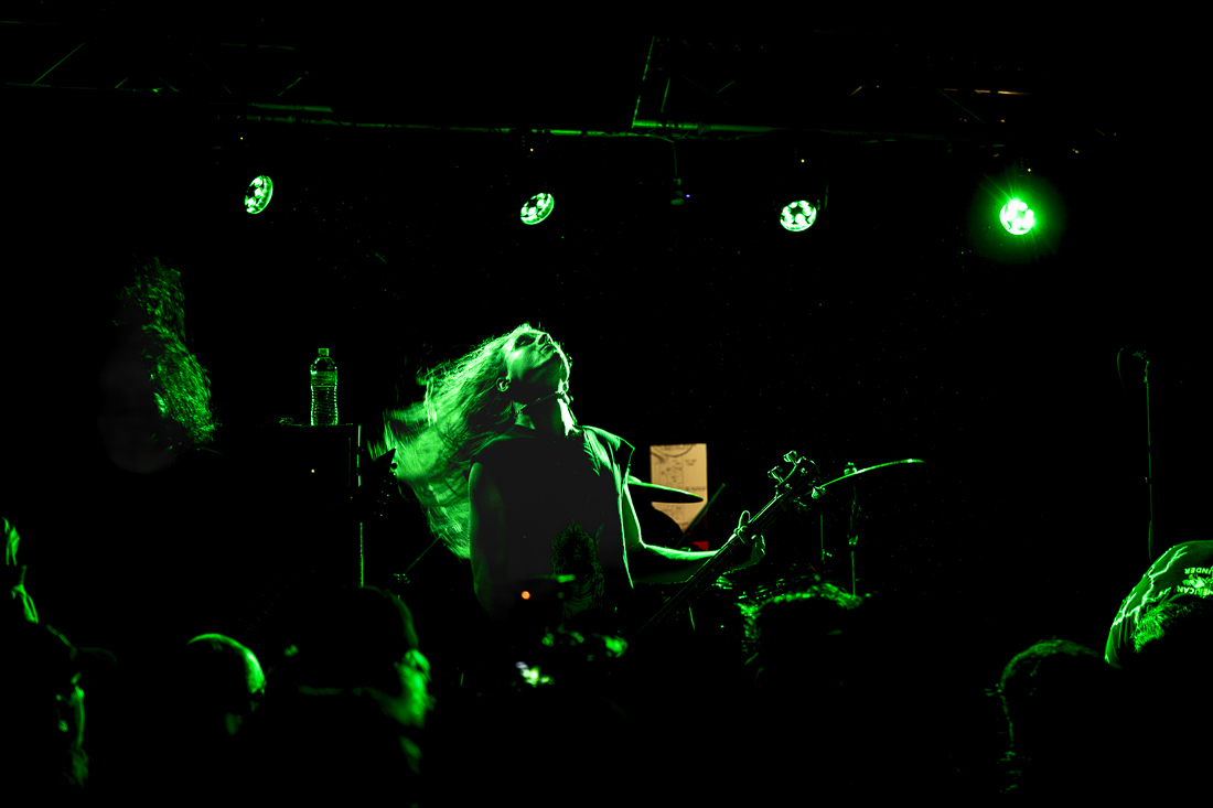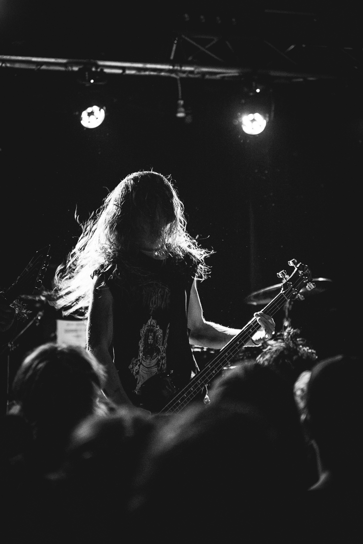 A massing crowd beset the front of the stage; the perfect blend of familiar faces as well as new and curious listeners, including myself. Descent’s reputation was not lost on me by any means, and their outright weaponisation of blast beats, tremolo riffs and sinister harmonies immediately seized the attention of the room. The five-piece wear their influences on their sleeve as we were treated to the influential workings of iconic bands like Cannibal Corpse and Nails, much to my personal delight.