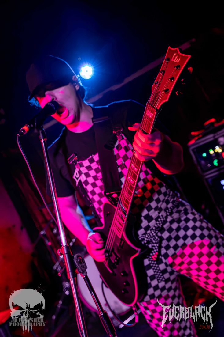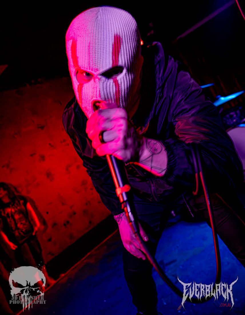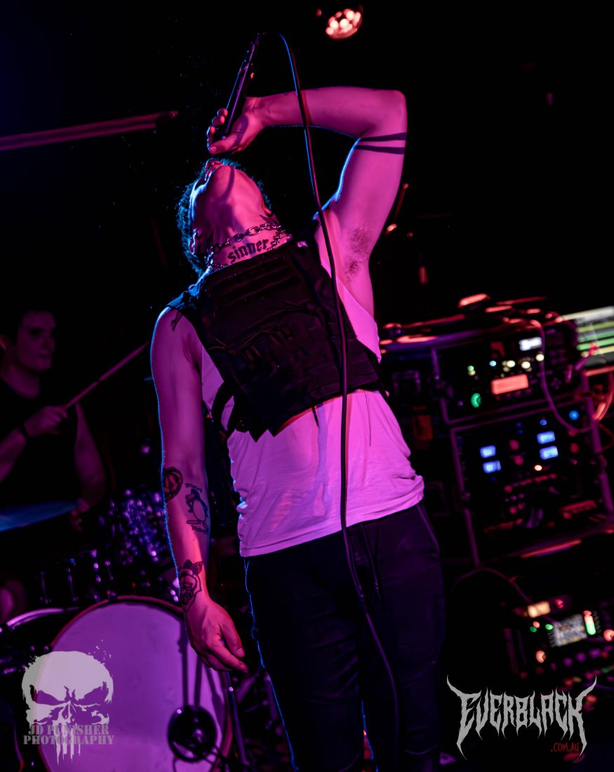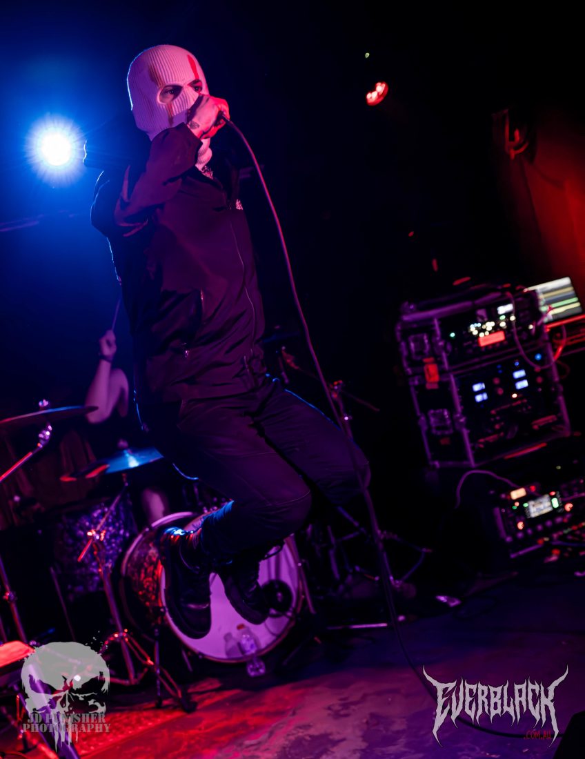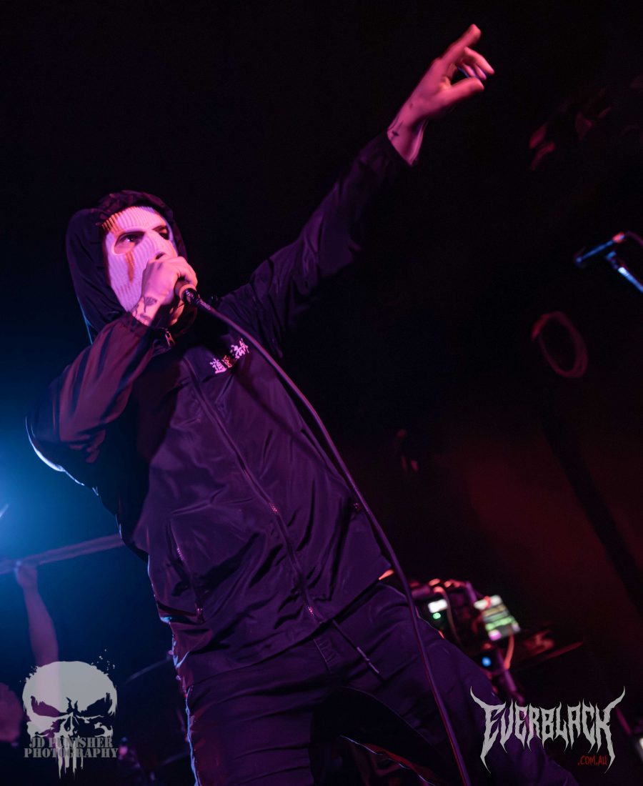 Hailing from Canberra, the genre combining 3 piece ST. SINNER are supporting their mates Vilify for the tour, and boy are they a treat. Frontman Rory “St. Sinner” Maclean has one hell of a stage presence when they hit the stage, conducting the crowd of punters that seem a little unsure what to make of the black clad, white balaclava wearing persona that swaps from sweetly crooning pop vocals to growling roars. His compatriots Sam Thornhill and Caleb Jonas are tight in their performance with the well composed songs, backed by electronica backing tracks.