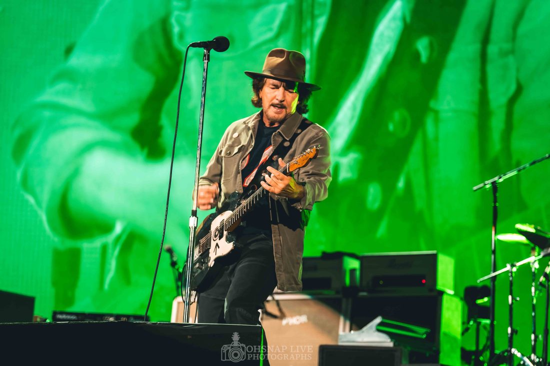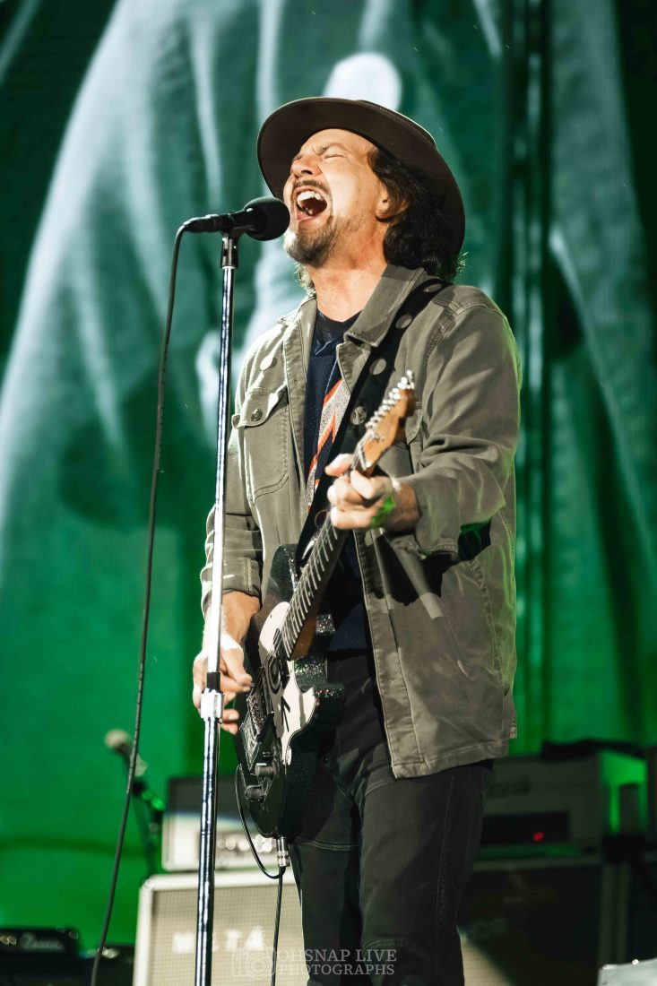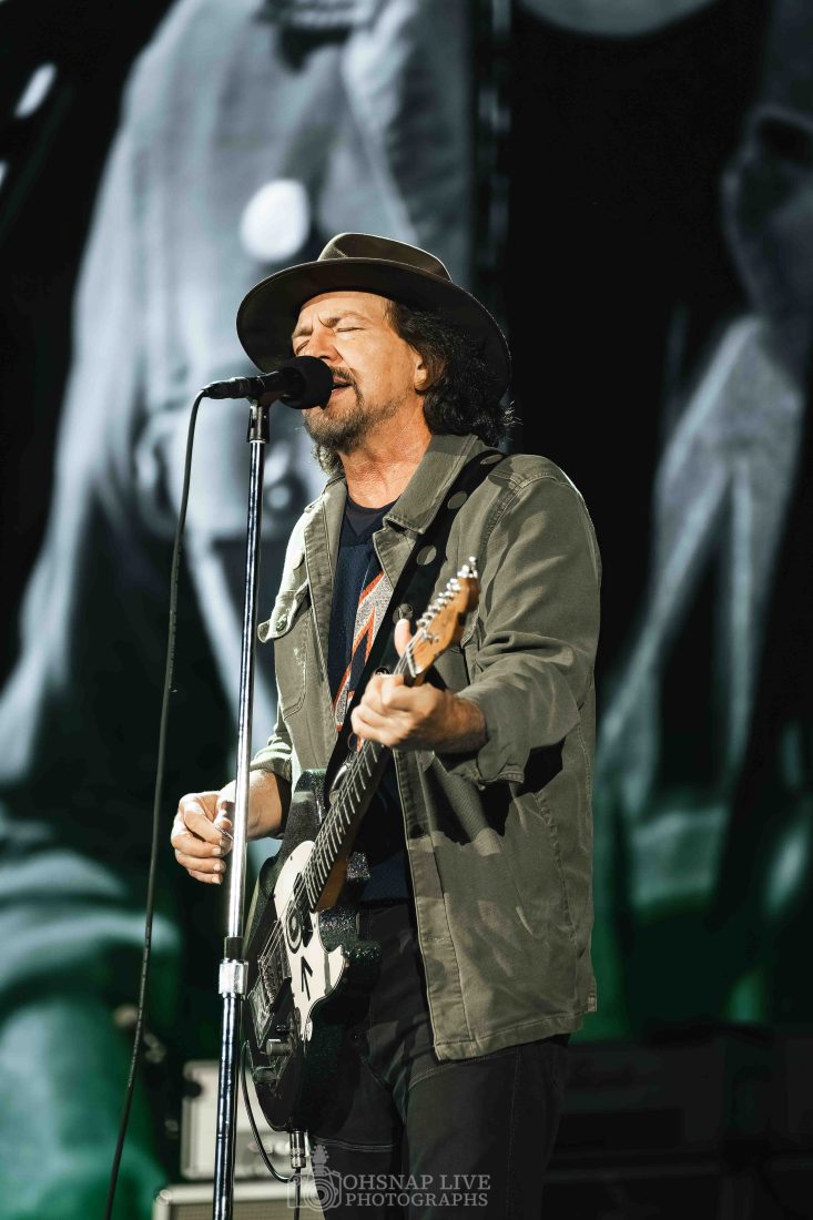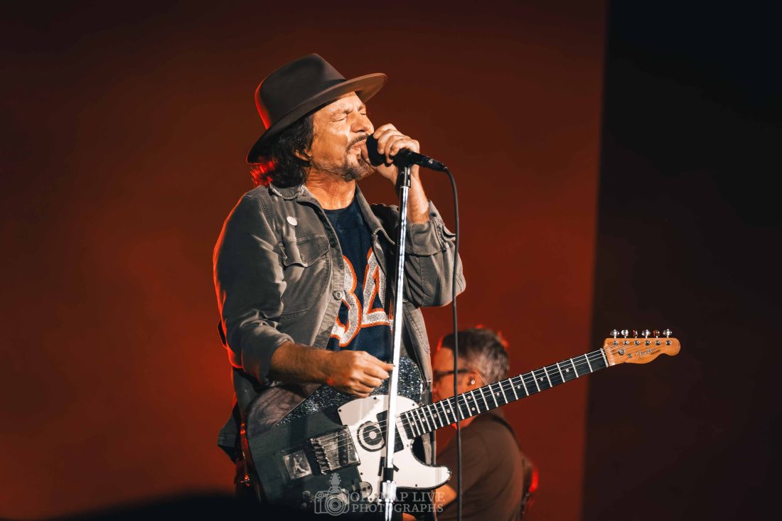 From the outset, whether standing free or with the guitar slung, Eddie Vedder is a ball of energy. He may not be climbing scaffolding and hanging from rafters the way he was 30 years ago but he still finds energy to dart around stage and show off his still impressive projection and vocal range in tracks like ‘Elderly Woman Behind A Counter In A Small Town’ and ‘Given To Fly’ in the first 15 minutes.