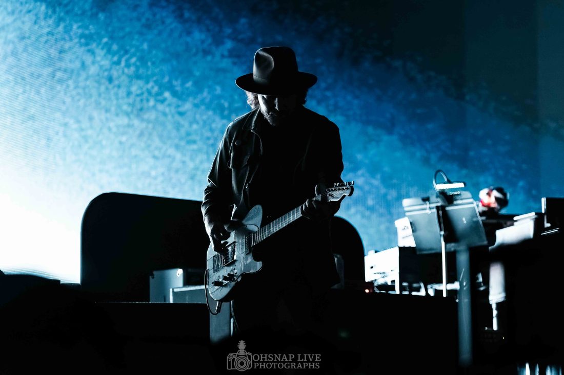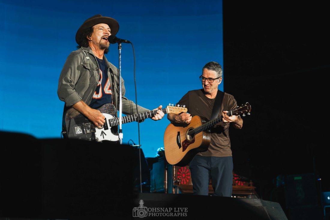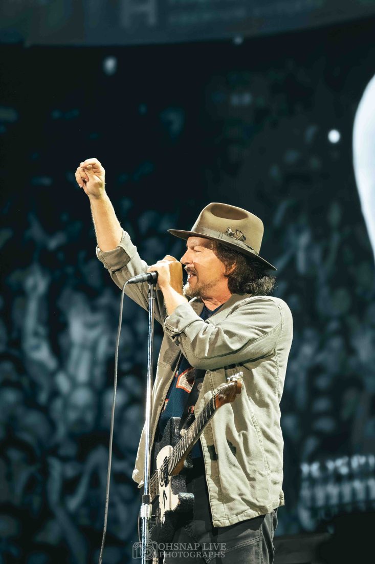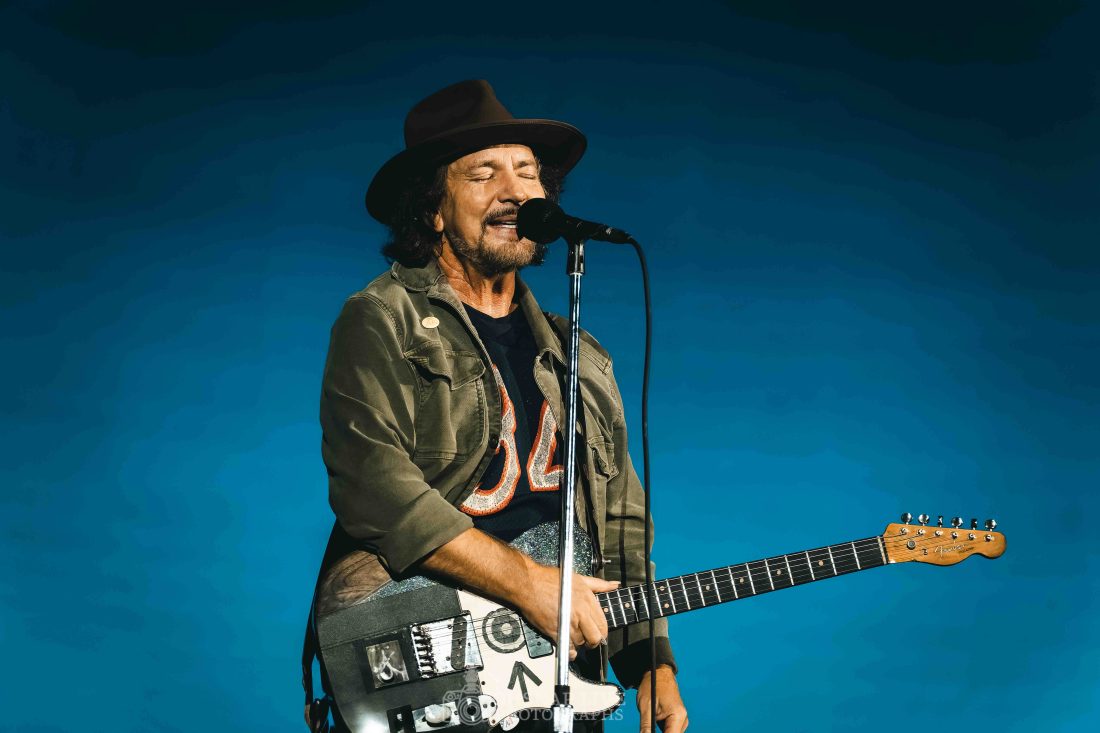 From the outset, whether standing free or with the guitar slung, Eddie Vedder is a ball of energy. He may not be climbing scaffolding and hanging from rafters the way he was 30 years ago but he still finds energy to dart around stage and show off his still impressive projection and vocal range in tracks like ‘Elderly Woman Behind A Counter In A Small Town’ and ‘Given To Fly’ in the first 15 minutes.