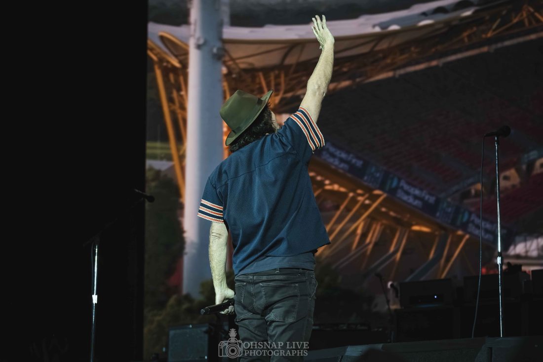 Guitarist, Mike McCready has clearly not been wearied by the touring band lifestyle. During ‘Even Flow’, he commands just as much attention as Vedder as he stands staring with intensity into the faceless void of thousands at his feet, his guitar behind his head shredded by convulsing arms and fingers. Jeff Ament and Stone Gossard lays the groove down behind him as he shreds perfect solos until the last bar when he rejoins Matt Cameron’s arrhythmia and reality where this kind of virtuosity shouldn’t even be possible.