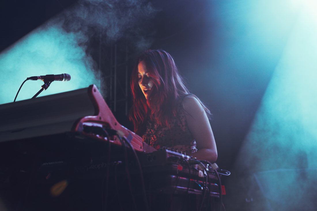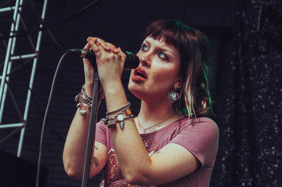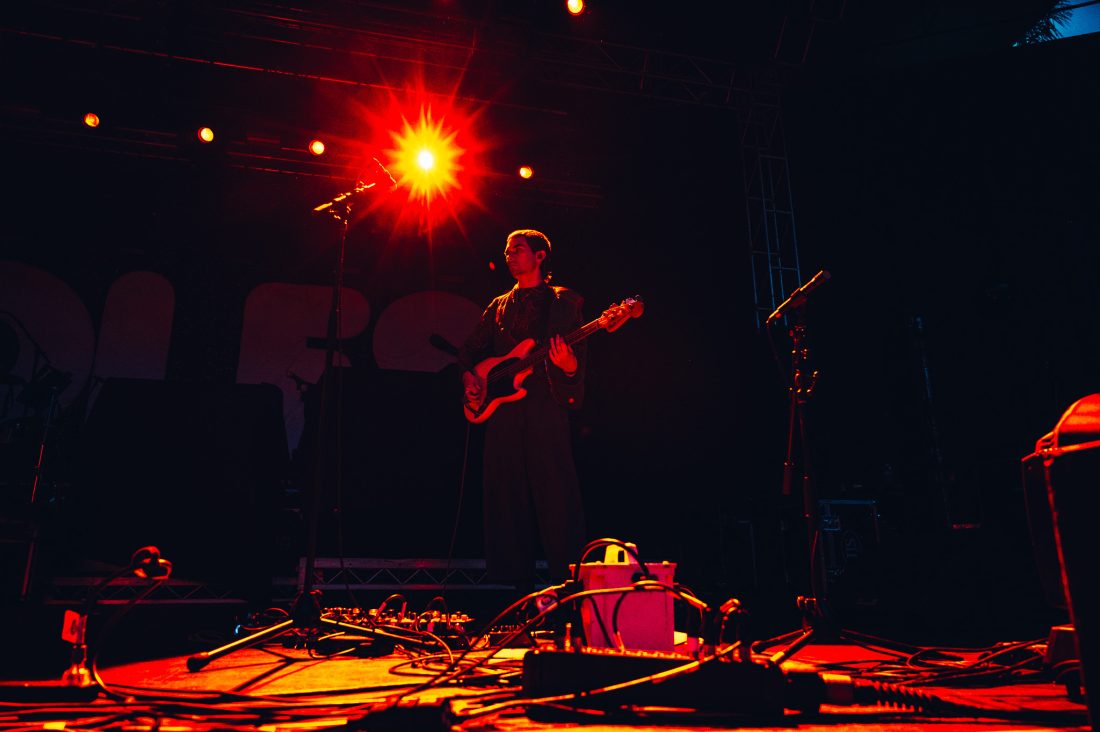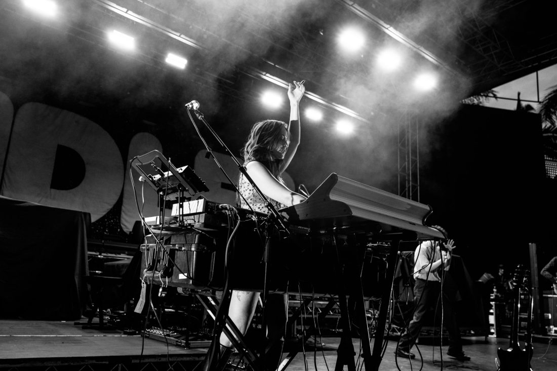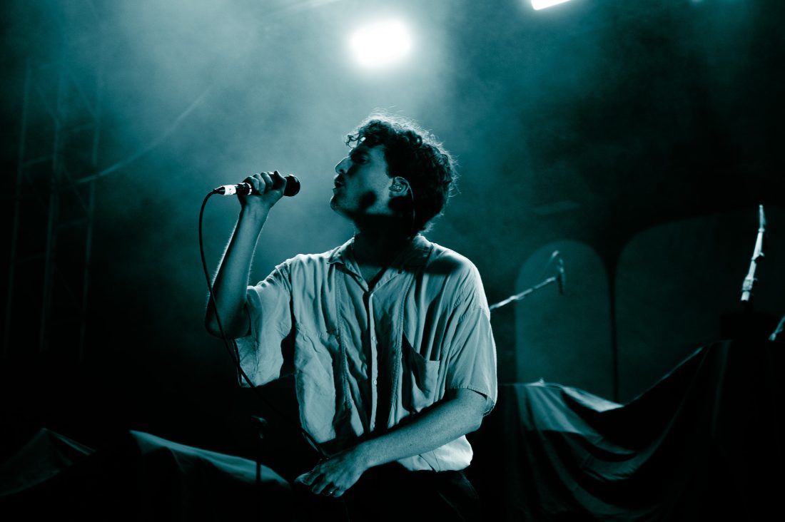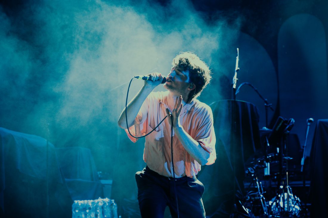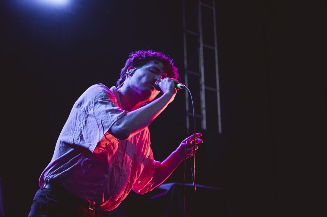 The band start with On Division Street with synths at the front of the mix and vocalist Ian Richard Devaney, showing that his studio monotone is not consistent with his live performance and he slinks and dances around the stage, at times lost in the band’s creations. They close out the first few songs as the rain, previously spitting, was now falling a sheet across the hillside and much of the crowd seek shelter at the foot of the stage, in a huge win for the support slot.