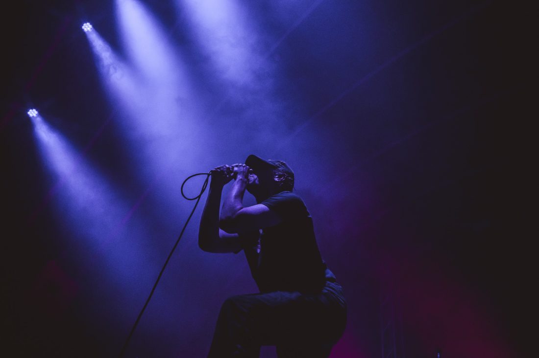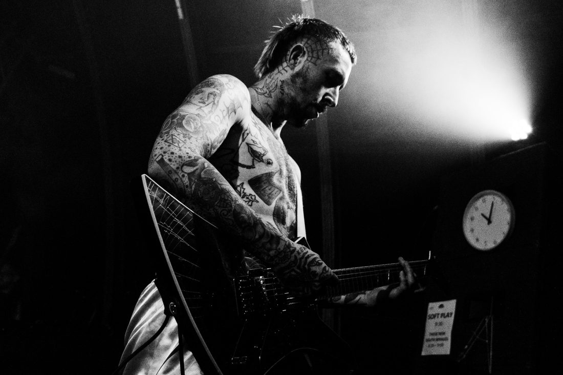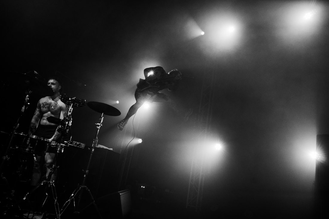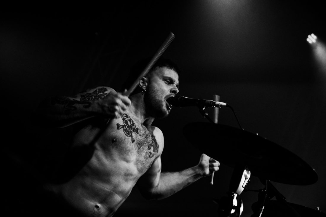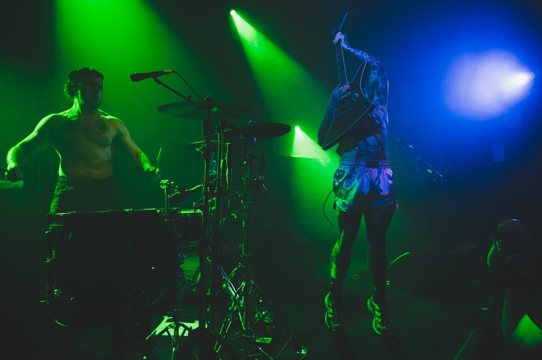 The set is stacked at the top with Heavy Jelly highlights, ‘Bin Juice Disaster’, ‘Isaac Is Typing’ and ‘Act Violently’ all appearing in the first handful of tracks before the duo take to the floor or the triffid, where I was previously standing, for an impromptu knee-slide demonstration followed by a chaotic ‘Fuck The Hi-Hat’ from 2016’s Take Control release. Laurie informs us that Isaac has been suffering a migraine today, which makes this performance even more impressive as screams each hoarse verse from his throat with head-rattling intensity.