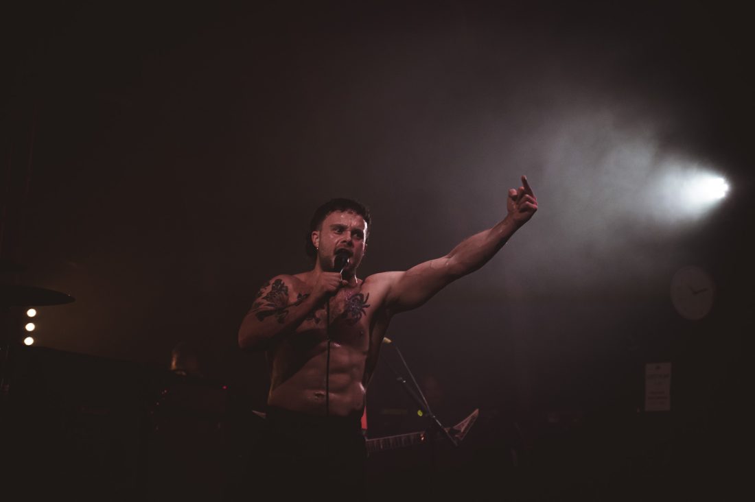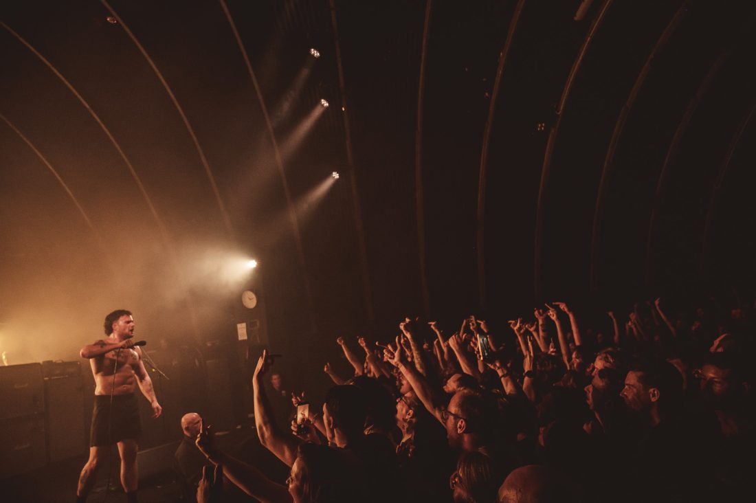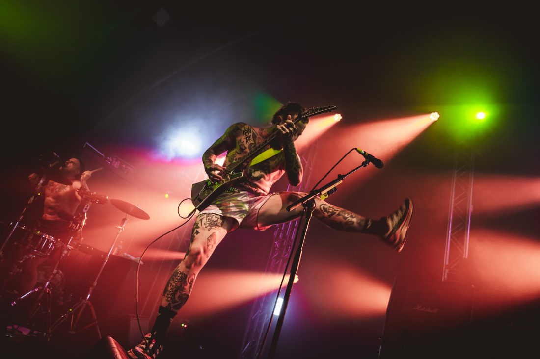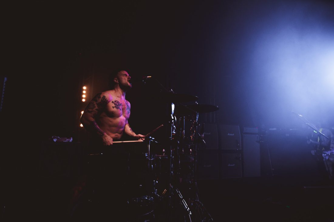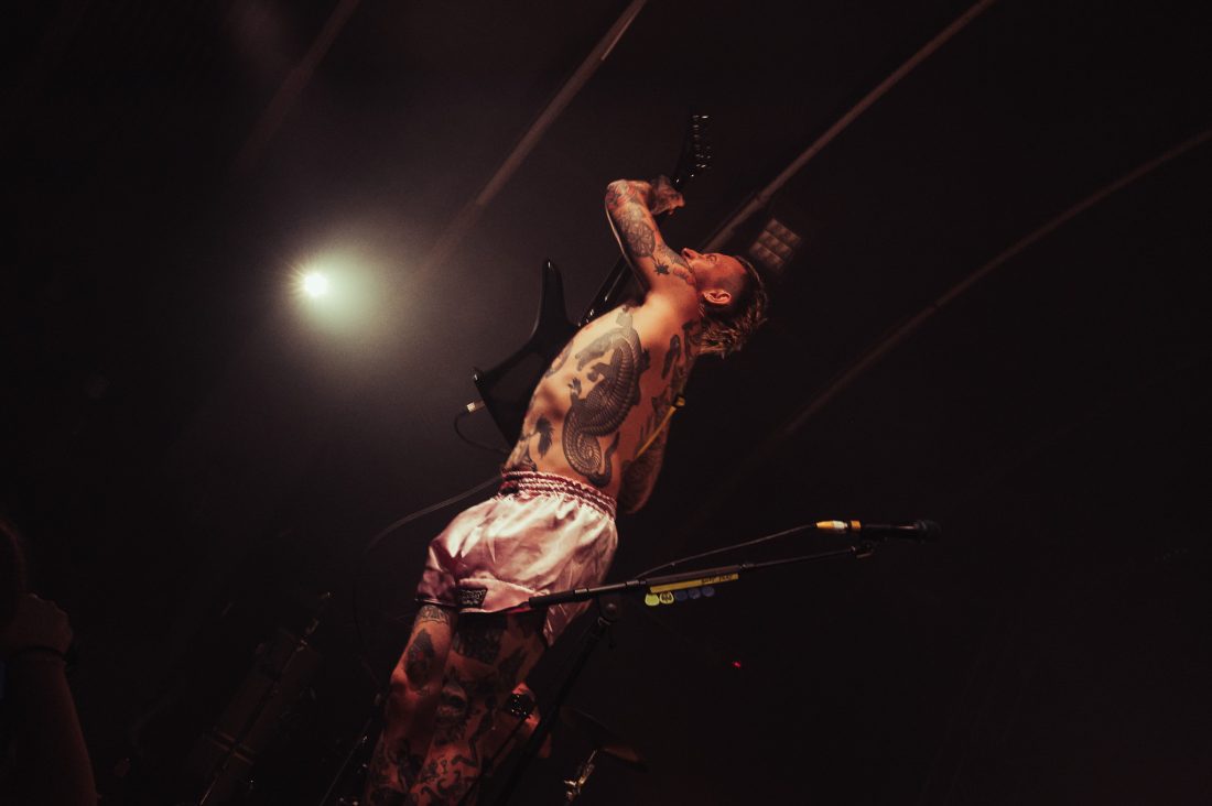 The wait between bands drags on, and quick friendships form in the pit. I’d love to say the boisterous blonde behind me let out a charming yell after each filler track, but that wouldn’t do justice to the sheer abrasiveness of whatever that was. Nearly an hour of this from when These New South Whales shut up shop, finally the music stops, one last excited yelp, and the house lights dim and stage glows yellow as the opening sample to ‘All Things’ fills the venue and the lads, shirtless and in only their boxers emerge on stage. They stare at the crowd, kick in and it’s on. “I’m the nicest dickhead you’ve ever met!” bellows Isaac from behind his kit as I feel two hands on my back before being shoved forward, propelled through a forming circle pit to the barrier.