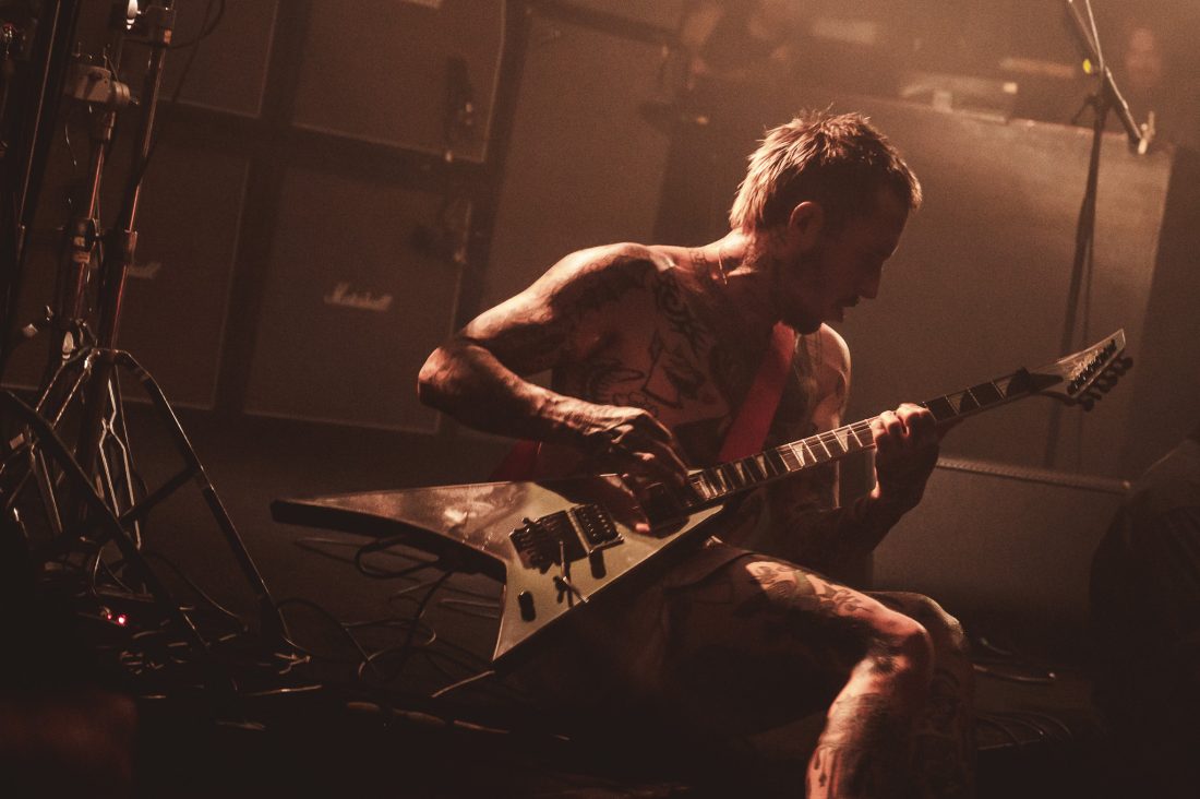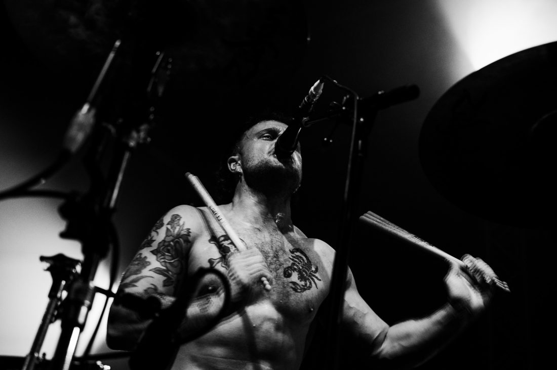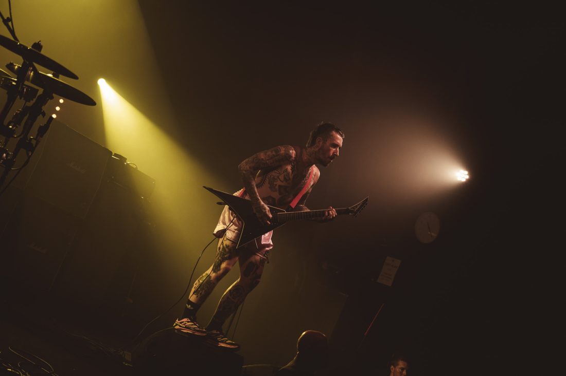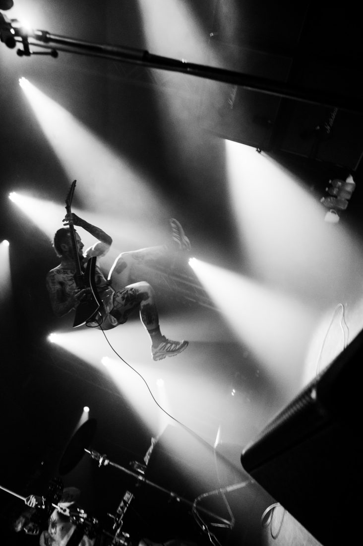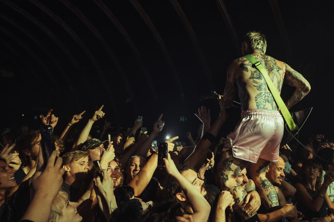 The wait between bands drags on, and quick friendships form in the pit. I’d love to say the boisterous blonde behind me let out a charming yell after each filler track, but that wouldn’t do justice to the sheer abrasiveness of whatever that was. Nearly an hour of this from when These New South Whales shut up shop, finally the music stops, one last excited yelp, and the house lights dim and stage glows yellow as the opening sample to ‘All Things’ fills the venue and the lads, shirtless and in only their boxers emerge on stage. They stare at the crowd, kick in and it’s on. “I’m the nicest dickhead you’ve ever met!” bellows Isaac from behind his kit as I feel two hands on my back before being shoved forward, propelled through a forming circle pit to the barrier.