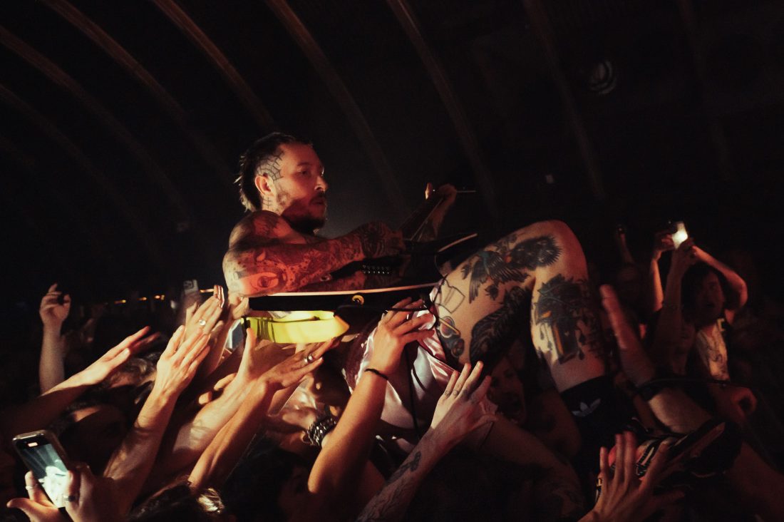 Dozens of other punters press toward the front as ‘Mirror Muscles’ starts and does nothing to allay the madness. It escalates and hits fever pitch as Laurie appears at the barrier, looming over the front of the crowd before launching himself into it, guitar and all, in the first of many attempts at stage diving tonight.