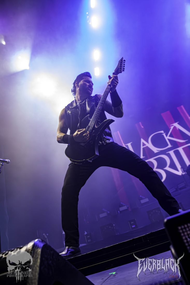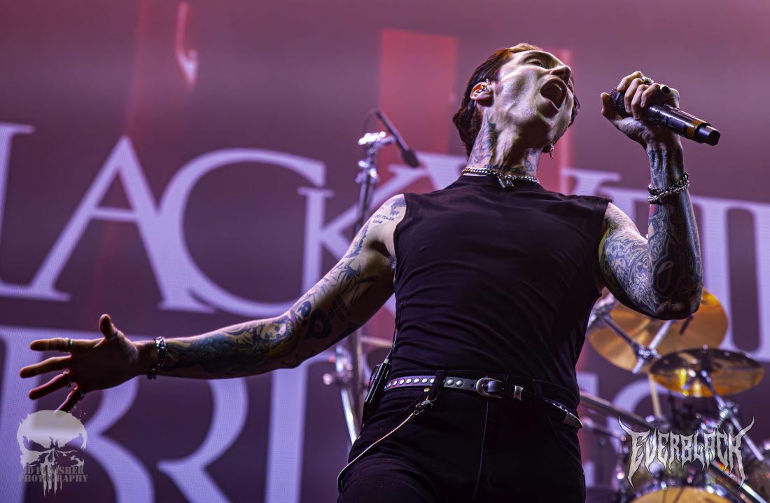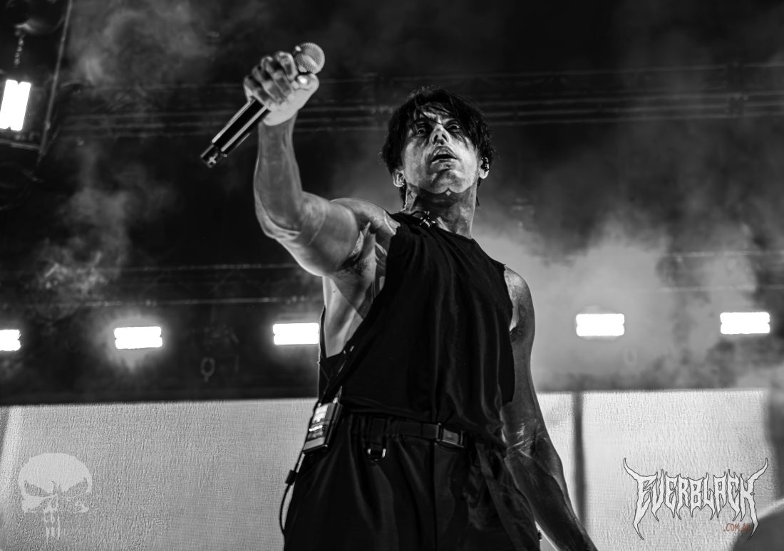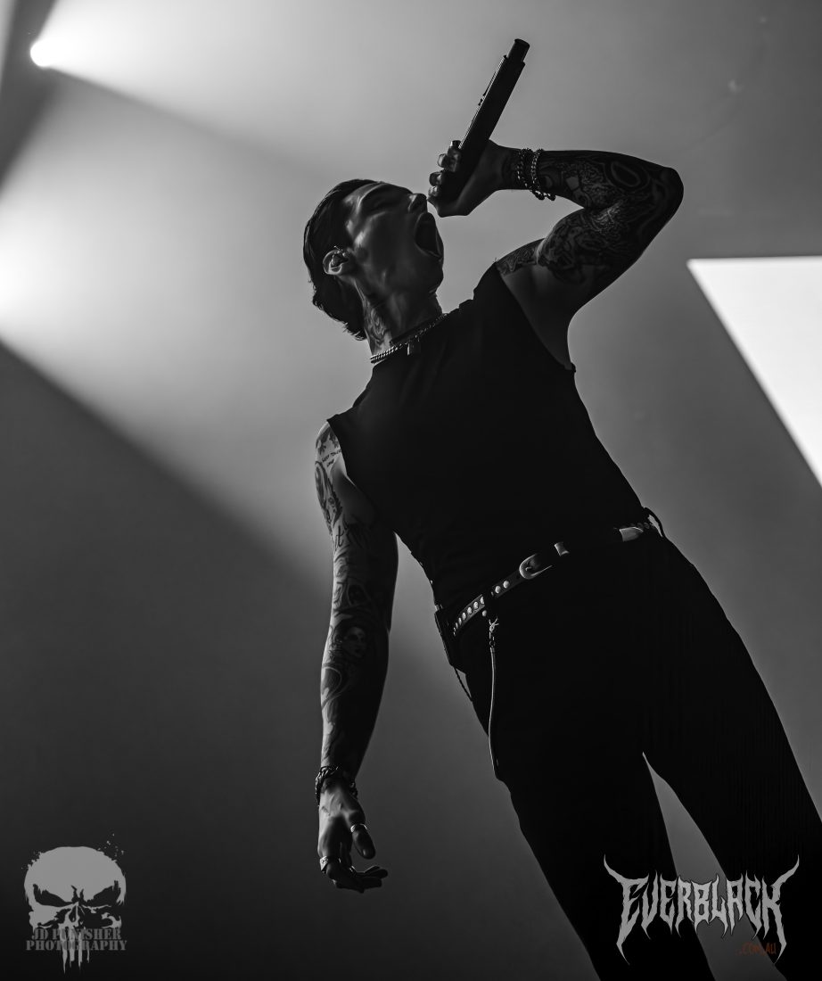 A red glow blanketed the stage as the Black Veil Brides took their places in the gloom. Opening with their classic track Knives and Pens, guitarists Jinxx and Jake Pitts stood back to back dueling, while frontman Andy Biersack smirked between lines of vocals. The prowess and power of the frontman were insane, with such projection making the singer hold the mic a foot from his face.