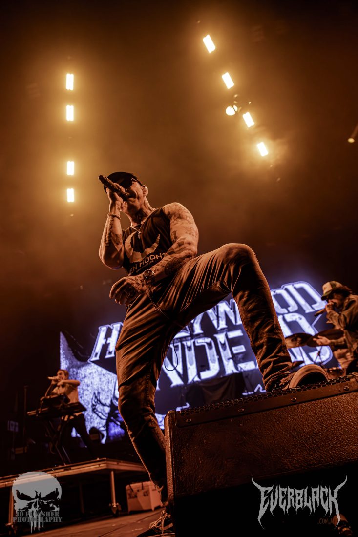 First to hit the stage are the masked hip-hop rockers Hollywood Undead, unmasked and ready to roll. “What is up my Aussies?!” screamed Funny Man as the 6 band members took to the stage, jumping straight into California Dreaming from 2017’s Five.
