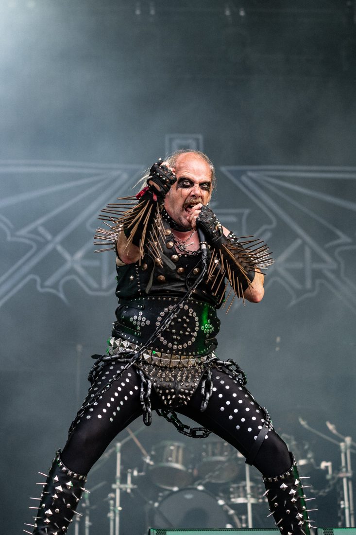 After a quick pit stop at camp for whatever mystery booze was still on the table, we high-tailed it back to the Headbangers Stage for some good old Scandinavian chaos courtesy of Sweden’s Hellbutcher. One half of Nifelheim’s legendary maniac brothers, Hellbutcher himself marched on with his crusade for Real Black Speed Metal and he definitely wasn’t there to fuck spiders. “Are you ready for some fucking metal? We’re playing our whole album… we only made one!” He grinned, before tearing straight into Perdition. Leather, spikes, chains and yes, a shiny codpiece, the stage looked like a satanic armoury and the energy was feral. They closed out with three blistering covers: Iron Maiden’s Instrumental Losfer Words (Big ’Orra), Bathory’s Die in Fire and a face-melting take on Venom’s Black Metal that turned the Headbangers Stage into pure bedlam. As Hellbutcher stalked off, his belt flashed its final sermon: “FUCK OFF.” Consider the message received.