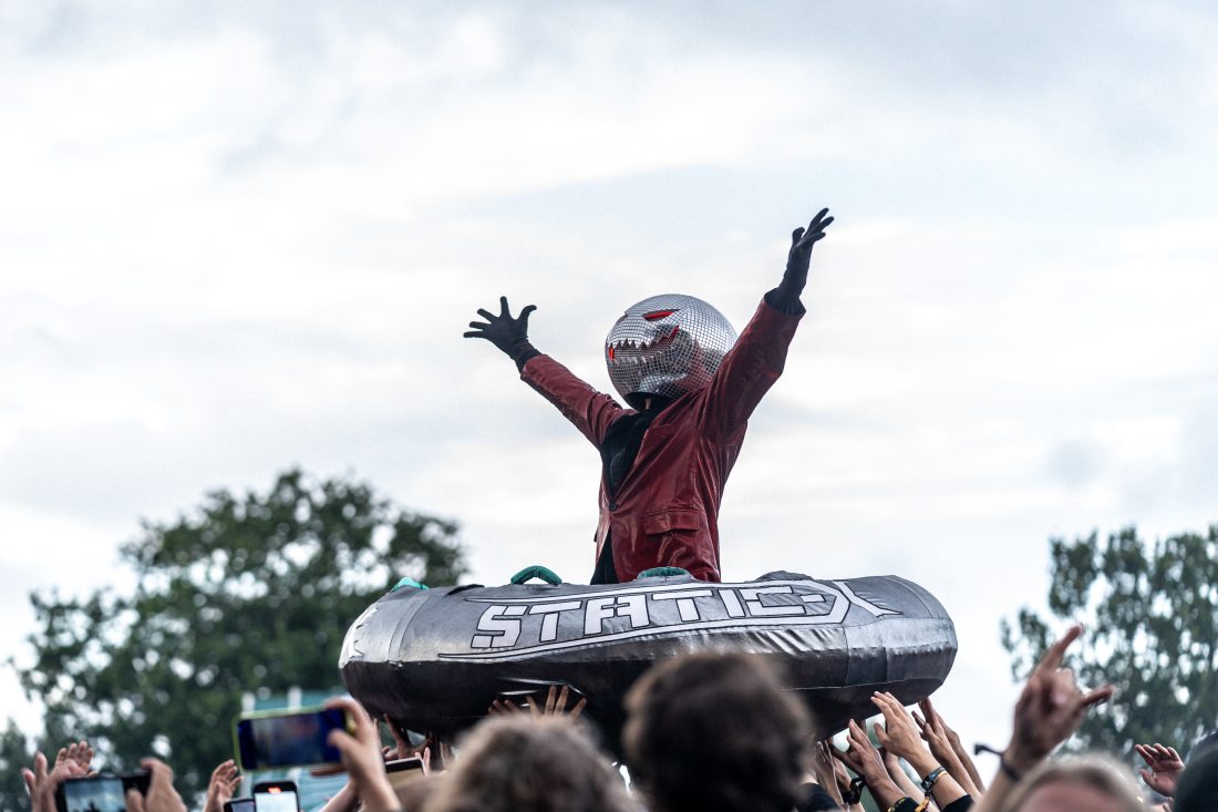 Spooky coincidences aside, Xero was pure chaos incarnate. The set itself was a carnival of weird, masked mascots with giant heads shooting smoke guns, a disco-ball pumpkin dude crowd-surfing in an inflatable raft and at one point, a bubble machine gun blasting smoke-filled bubbles all over the pit. Beach balls flew, mud splattered and just when we thought it couldn’t get any more unhinged, the sample line from I’m With Stupid, “Wanna grab my shovel?”, kicked in and the place exploded into a proper jumping moshpit. They closed with the Wisconsin Death Trip time machine that is Push It, yanking us all the way back to 1999. Xero’s delivery was sharp, the havoc was dialled to eleven, and you couldn’t help but think Wayne was smiling somewhere.