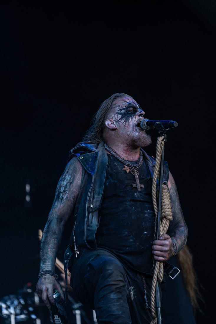Over to the Headbangers stage Norway’s Svarrtjern shared their unnerving blasphemy with us, complete with ropes tied in hanging nooses swinging from their microphone stands. Vocalist Hans Fyrste is vile, he grabs his junk and spits blackened mess onto the stage, he truly is the Prince of Disgust and aptly they opened with that track. The corpse paint and blood melted down his face as he snarled through gritted teeth, “I’m sorry, it’s another love song, we call it All Hail Satan”, which pulled the crowd out of the mud and into a fist pumping fury. Through the echoes of distorted guitars they ended on Code Human and as always, Svarrtjern’s raw take on underground black metal leaves you rattled. Their presence drips with unholy energy made for an experience that’s unsettling yet impossible to look away from.