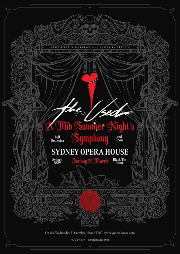 Wednesday, November 26, 2025 – For over 25 years, THE USED have ticked off a multitude of milestones, with their influential career shaping the landscape both in and beyond emo and alternative rock. But in 2026, THE USED will tick off yet another monumental first in their extremely storied career, set to perform for the first time ever on the legendary stage of the Sydney Opera House for one unforgettable black tie event, complete with a full symphony orchestra and choir on Sunday 29 March 2026.