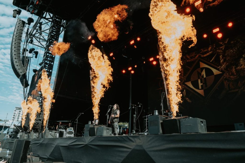 The intro to “Imperium” rings out through the main arena and signals the arrival of Robb Flynn fronting a rare three-piece version of metal titans Machine Head. The massive crowd wastes no time moshing along to the frontman’s guttural roars and crushing rhythms, appropriately accompanied by a flurry of pyrotechnics. As one of the heavier bands on the bill, it’s surprising just how many punters have come to watch them play, which stands as a testament to Machine Head’s staying power and Flynn’s never-say-die attitude.