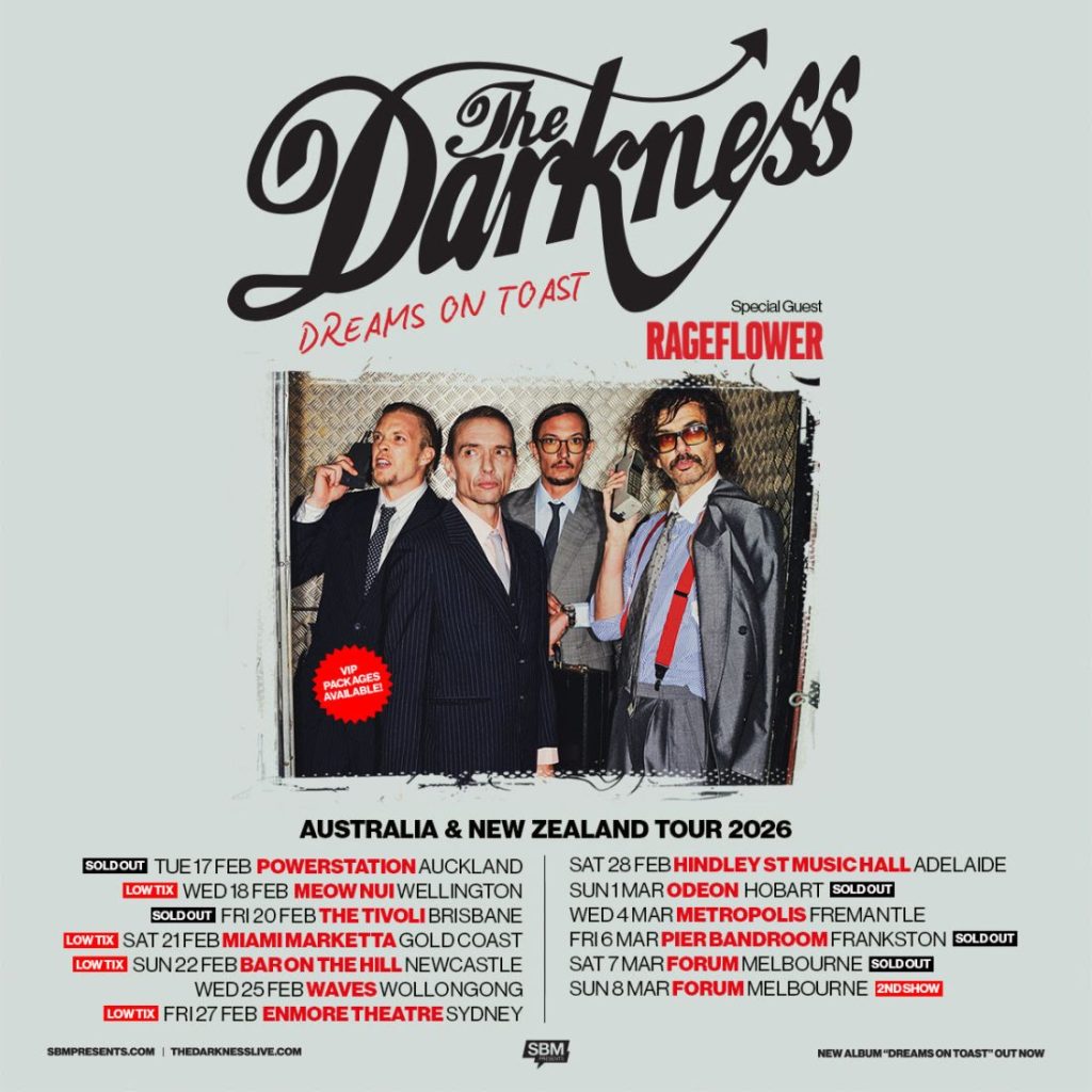 Multi-platinum UK rock royalty The Darkness will make their triumphant return to Australia and New Zealand in February 2026 for an epic run of summer shows, hitting Brisbane, Gold Coast, Newcastle, Wollongong, Sydney, Adelaide, Hobart, Fremantle, Frankston and Melbourne, plus two big nights in Auckland and Wellington.