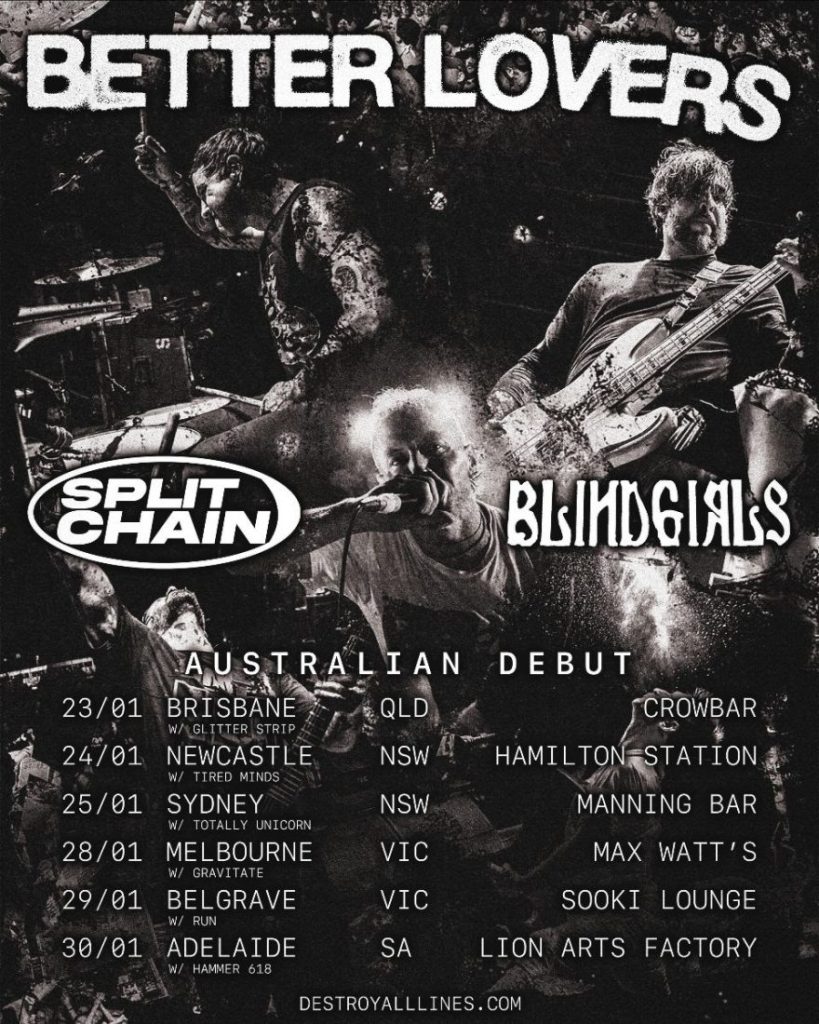 In early 2026, the beautiful chaos that is BETTER LOVERS, comprised of Greg Puciato (vocals), Jordan Buckley (guitar), Will Putney (guitar, producer), Steve Micciche (bass) and Clayton “Goose” Holyoak (drums), will head down under for their Aussie live debut in January, joined by special guests SPLIT CHAIN and BLIND GIRLS. And today, BETTER LOVERS have unveiled their local support acts for Brisbane, Newcastle, Sydney, Melbourne, Belgrave and Adelaide.
