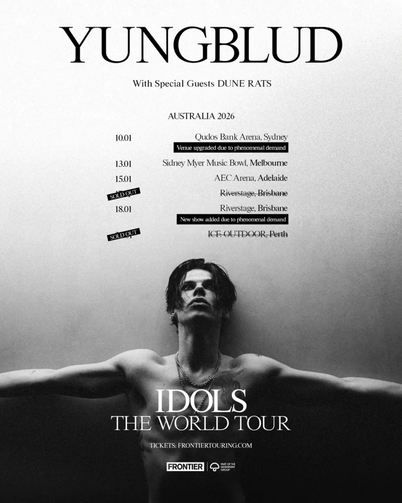 Following the release of One More Time—his collaborative EP with Aerosmith, which debuted at No. 1 on four Billboard album charts and No. 1 in the UK, and features a reimagining of ‘Wild Women’ with country star Lainey Wilson—YUNGBLUD will head to Australia in 2026 for his biggest run of shows to date. With Perth and Brisbane dates already sold out, an additional Brisbane show has been added, and Sydney has been upgraded to Qudos Bank Arena to meet overwhelming demand. Tickets and tour information via frontiertouring.com/yungblud.