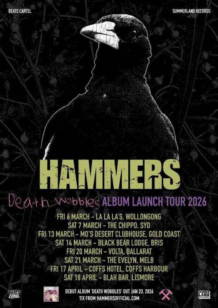 Kicking off on Friday 6 March in Wollongong, HAMMERS will trek through Sydney, the Gold Coast, Brisbane, Ballarat, Melbourne and Coffs Harbour, before concluding on Saturday 18 April in Lismore. Tickets for the DEATH WOBBLES Album Launch Tour are on-sale now from: https://www.