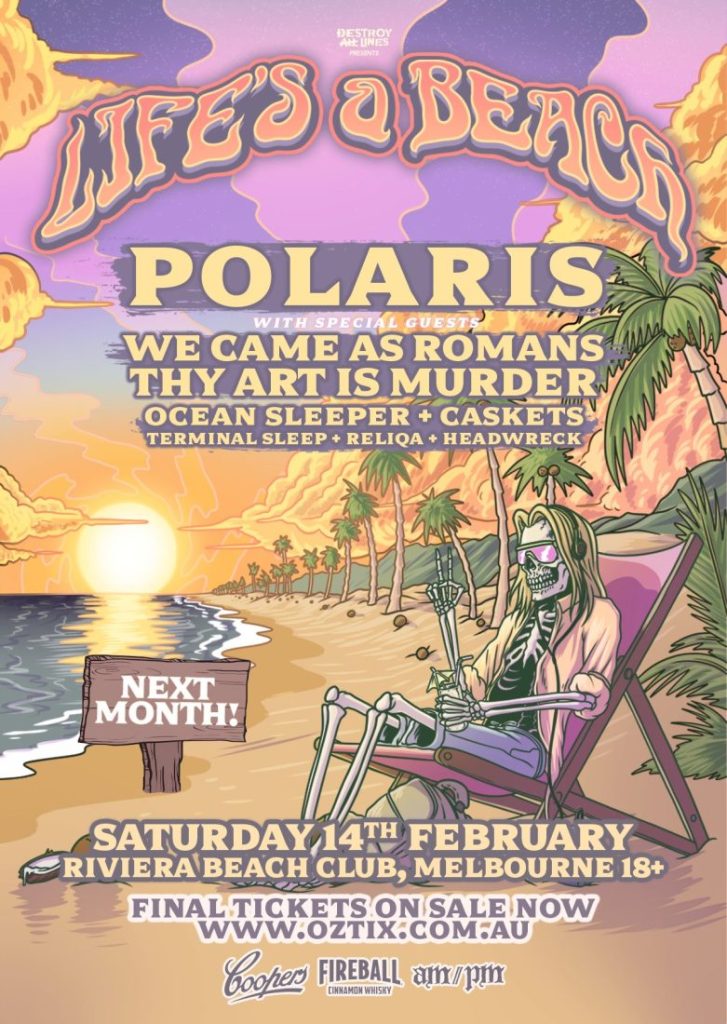 Headlined and curated by POLARIS, LIFE’S A BEACH will feature some of Australia’s most exciting up-and-coming artists alongside some international icons including WE CAME AS ROMANS (USA), THY ART IS MURDER, OCEAN SLEEPER, CASKETS (UK), TERMINA