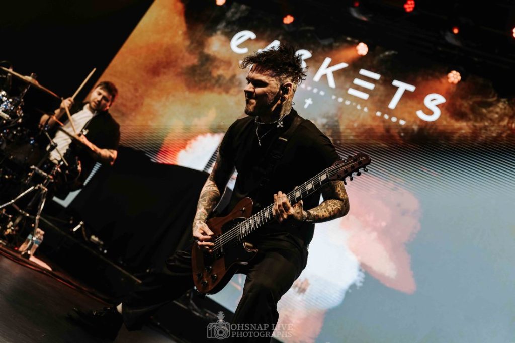Next up were UK quartet Caskets. On the back of releasing The Only Heaven You’ll Know in November with earworms like ‘Make Me A Martyr‘ and the title track, we were keen to hear some new material. If vocalist Matt Flood makes you want to dance one second and burst out in tears the next with the level of emotion in his voice on the records, you’d want to have your dancing shoes handy next to a box of Kleenex when seeing Caskets live. Not only limited to Flood’s vocals, but when an entire band’s performance leaves you feeling like the main character of a movie experiencing a whirlwind of emotions, they’ve done something right.