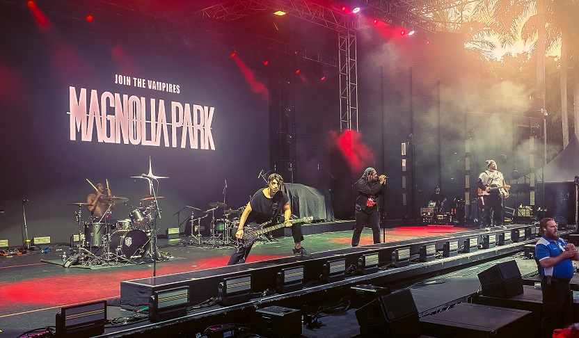 Tonight’s opening act is Floridian metal act Magnolia Park. The band race onto the stage with energy ready to destroy. The sun is still out, the line is still making its way through the gates, but the pit is filling up quickly and the infamous Riverstage incline is beginning to pack in. It’s no secret that at shows these days, sometimes the crowd just simply doesn’t show up instantly. And in a lot of cases, even an energetic and commanding opening act will struggle to get the crowd into the zone.